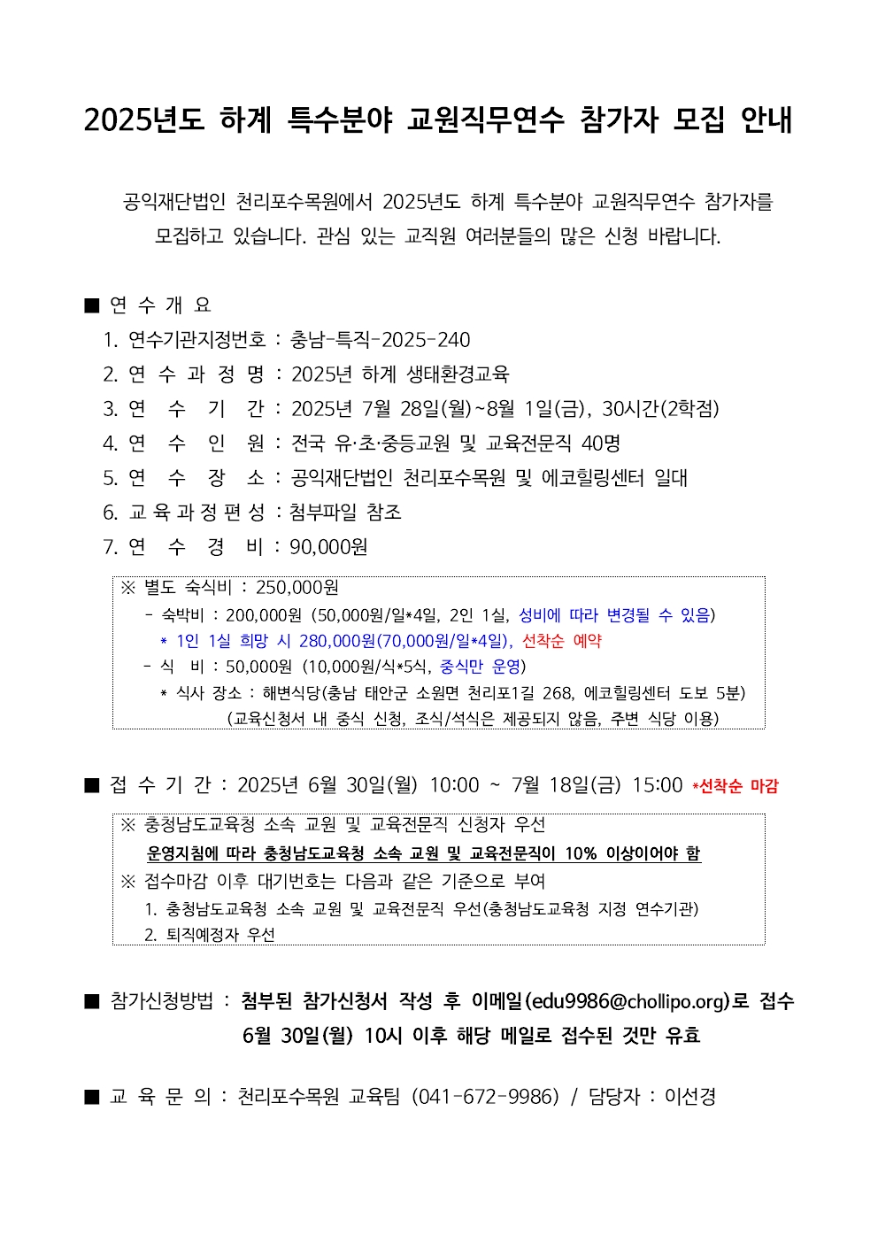 천리포수목원 2025년 하계 특수분야교원직무연수 모집이 시작됩니다.