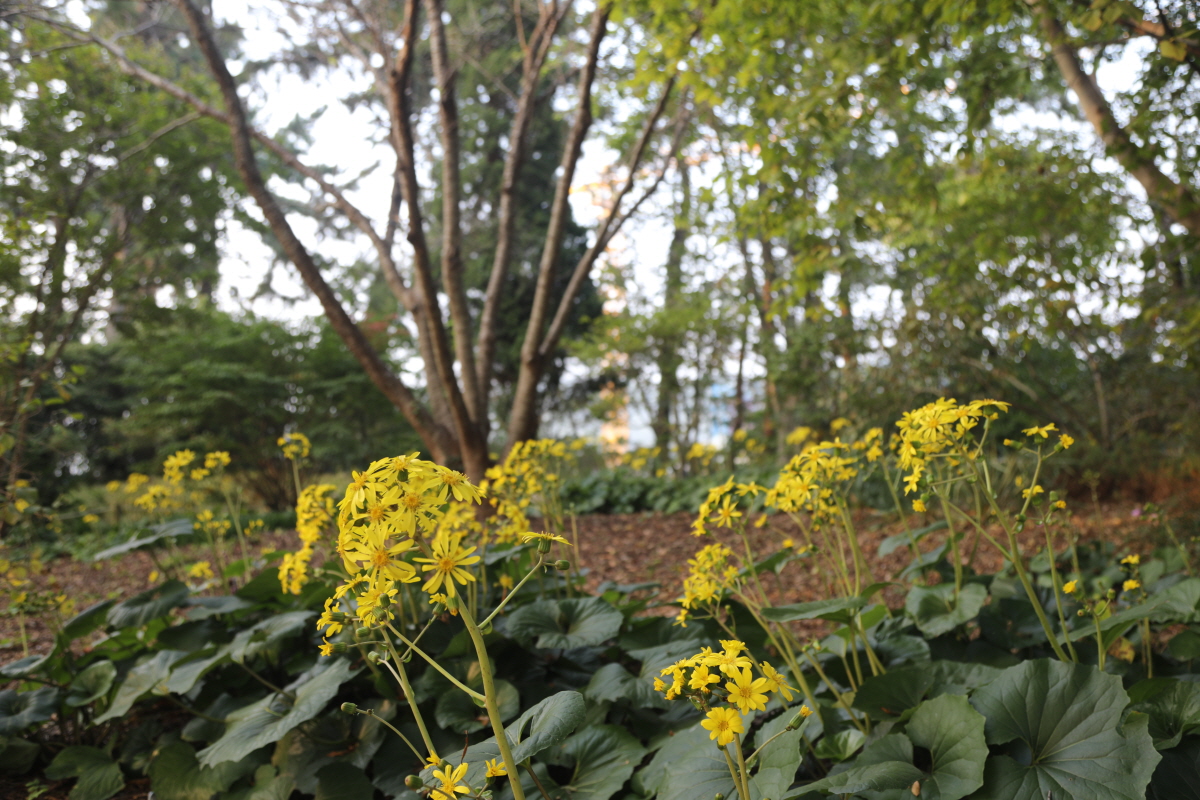 가을이 깊어질수록 천리포수목원의 나무 아래 노란빛 별이 반짝입니다. 짙은 초록색의 두터운 잎 사이로 줄기마다 고개를 숙인 꽃봉오리에서 고개를 치켜세우며 밝은 노란색 꽃송이가 피어오르는 이 식물은 바로 ‘털머위’입니다. 청명한 가을 하늘 아래 꽃이 귀한 시기 피어난 털머위는 가을 정원에 풍성함을 더합니다.
